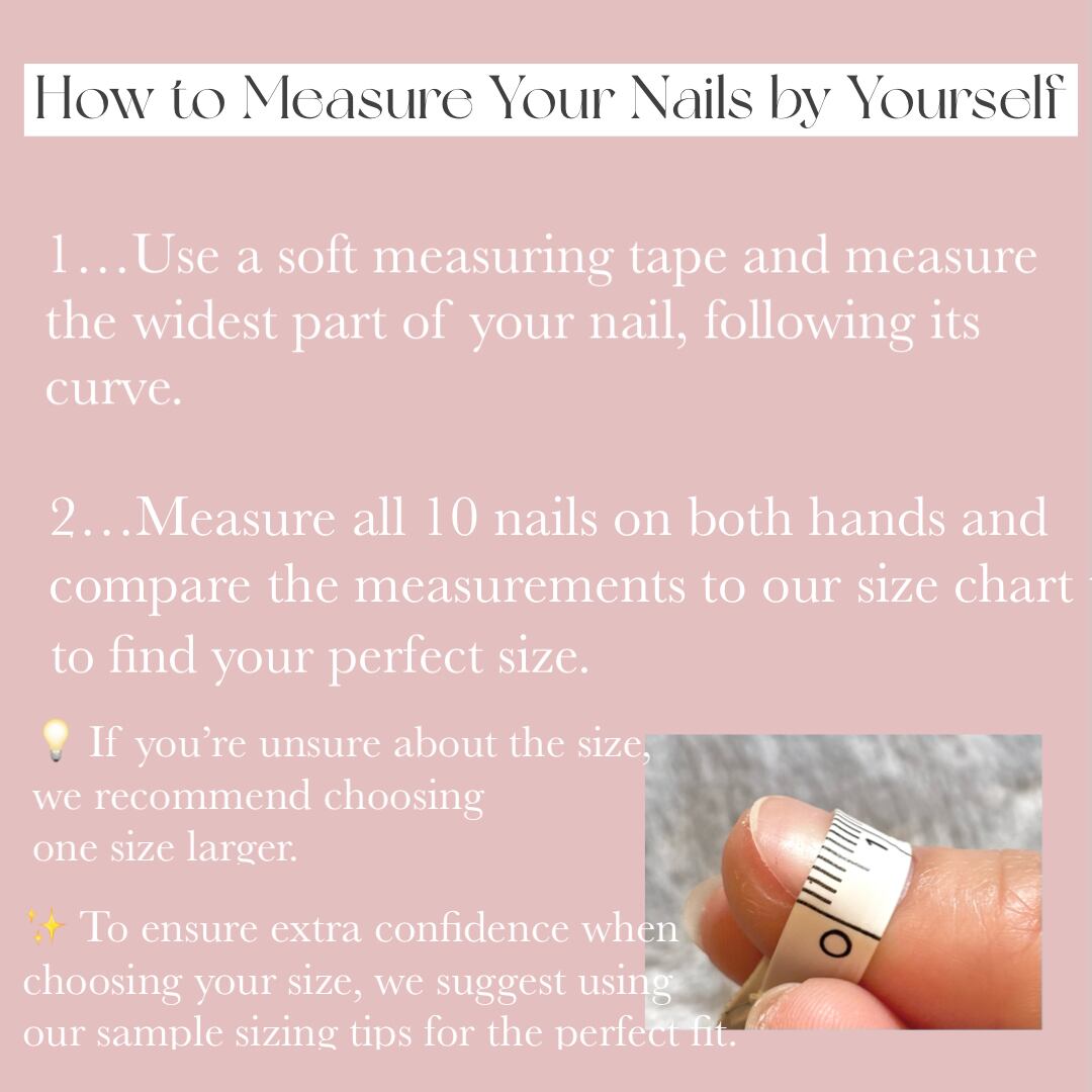 If you’re unsure about sizing, we recommend choosing a slightly larger size, which you can file down to achieve the perfect fit. (Nail files are available as an option.)