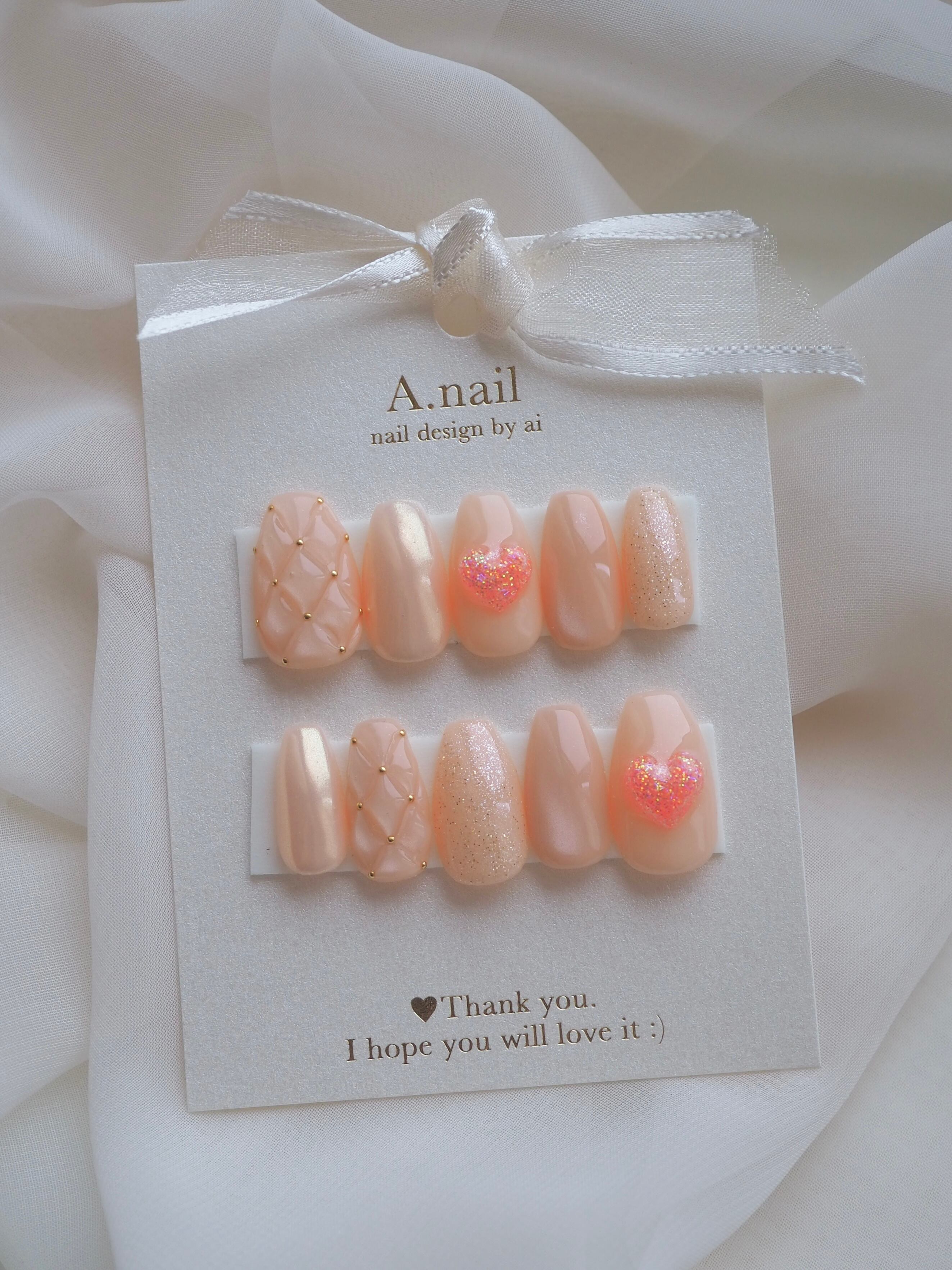◎ Even with the same design, nail sizes and shapes differ. Each nail tip is uniquely crafted, with variations in heart sizes, shell placements, and other details, creating a custom and personalized aesthetic. Enjoy a one-of-a-kind nail set made just for you! ♡゙