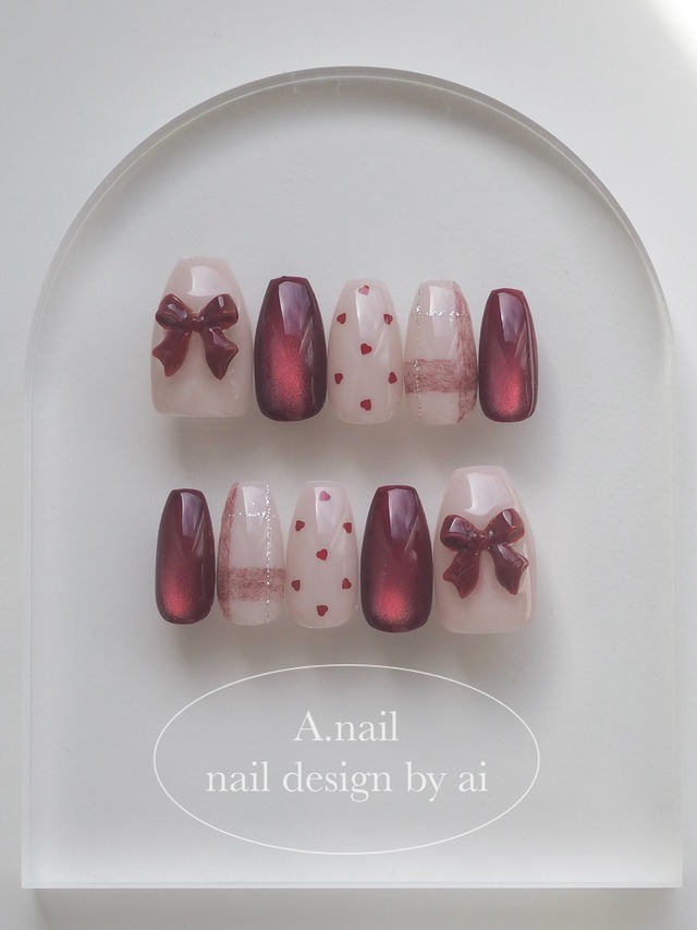 Velvet Ribbon – warm bordeaux ♥︎Luxury at Your Fingertips: Custom Press-On Nails♥︎ 【 Product Description 】 ◎ Each nail set is carefully handcrafted to fit your unique nail sizes, ensuring the perfect balance of design and art. ♫ ◎ Even with the same design, nail sizes and shapes differ. Each nail tip is uniquely crafted, with variations in heart sizes, shell placements, and other details, creating a custom and personalized aesthetic. Enjoy a one-of-a-kind nail set made just for you! ♡゙ ◎ Wear your nail tips with double-sided tape when going out, and easily remove them when you’re back home for reuse. These nail tips are designed like reusable accessories, perfect for any occasion. ✨ 【 What’s Included 】 • A set of 10 nail tips (thumb to pinky) or 15 nail tips. → Upgrade to 15 tips for an additional ¥1,800, offering a better value! ♥⃛ ※ For 15-piece sets, the placement of the additional 5 nail tips will be artist’s choice. • Care instructions • One set of strong double-sided adhesive ※ For additional double-sided tape or a nail tip case, please select your preferences from the options. 【 How to Order 】 1. Add your desired product to the cart. 2. Choose your nail tip shape and size (S, M, L). For custom size orders, please leave a message. Example: Short Oval, Right Hand (Thumb to Pinky) 0, 3, 2, 4, 7 / Left Hand 1, 3, 4, 5, 7 3. If this is your first time purchasing, we recommend trying our sizing kit with clear tips to find the best fit. 4. Select any additional options such as double-sided tape or nail tip cases. 5. Once you complete your purchase, we will begin preparing your order. Processing time is currently 10–14 days. 【 Shipping ✈︎ 】 ♥⃛ Please check our shop’s homepage for updated shipping dates. ♥⃛ All items are carefully packaged with bubble wrap and a touch of cute gift wrapping. ♥⃛ For rush orders, please contact us via message before purchasing. 【 For Those Ordering the Sizing Kit 】 1. Please mention your desired nail tip type in the order notes. 2. We will first ship the clear sizing tips to you. 3. After receiving the tips, please try them on and inform us of your measurements via message. 4. We will create the perfect custom nail tips for you! ♡゙ 【 How to Measure Your Nail Size 】 1. Use a soft measuring tape to measure the widest part of your nail along its curve. If you don’t have a measuring tape, you can use ribbon or masking tape to mark the width and measure it with a straight ruler. 2. Refer to the photos to select your preferred nail tip shape and choose the sizes that fit each nail (thumb to pinky). The measurements listed in the size chart indicate the width of the nail tips measured along the inside curve. If you’re unsure about sizing, we recommend choosing a slightly larger size, which you can file down to achieve the perfect fit. (Nail files are available as an option.)